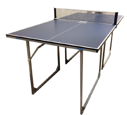 The JOOLA Midsize table is one of the company's best selling items. Made of the same superior quality as the other JOOLA tables, the Midsize boasts a 5/8 inch (16mm) playing surface. While still standing at the official table height, this compact table measures only 71 x 30 x 36 inches (W x H x D), which is about 2/3 the official size of a regulation table tennis table. The Midsize has been specially designed to fit where space is limited. The two separate table halves are ideal for storage and can even be used as two separate stand alone tables that can even serve as a card table. Legs easily fold underneath each half, minimizing the amount of space taken up while be stored under a bed, in the back of a closet, or against a wall. Weighs 62 pounds.Want a ping-pong table for your home but don't have the space? Turn to this Joola Midsized table tennis table, which satisfies your ping-pong itch without requiring thousands of dollars of remodeling. The Midsized table stands at a regulation 30 inches, but the length and width are roughly two-thirds of the regulation dimensions. This means the table not only fits in many apartments, but it also folds up easily for storage. The table, which includes a net and post set, measures 71 inches long and just under 36 inches wide.