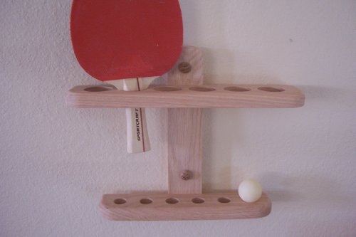 This product is one new handmade ping pong paddle & ball rack. It holds six paddles and six balls. It is made out of solid oak (mape and pine are also available). It is unfinished so it has the ability to be painted or stained. This makes a great, inexpensive present for people who love this game. Also, it helps organize a game room. (Paddle and ball are Not included.)